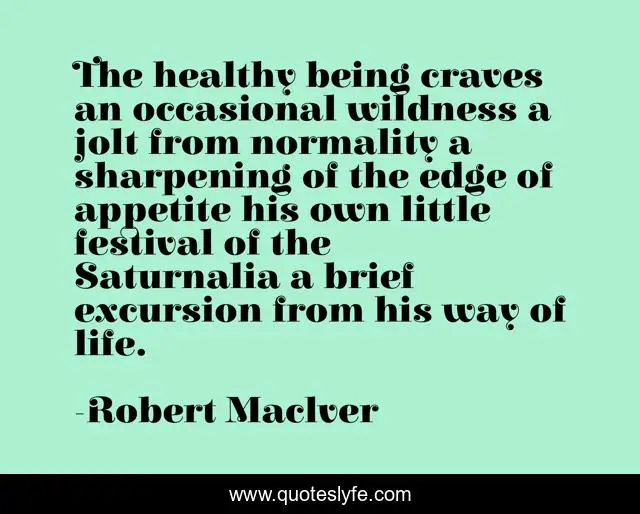 This page presents the quote "The healthy being craves an occasional wildness a jolt from normality a sharpening of the edge of appetite his own little festival of the Saturnalia a brief excursion from his way of life.". Author of this quote is Robert Maclver. .