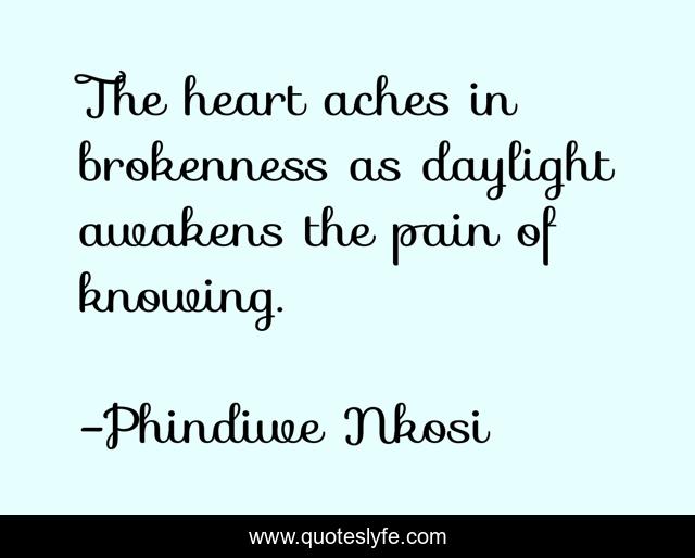 This page presents the quote "The heart aches in brokenness as daylight awakens the pain of knowing.". Author of this quote is Phindiwe Nkosi. This quote is about death, love, grief, broken, tears, book, best-seller, pain, affection,.