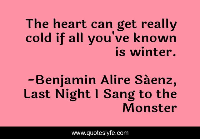 This page presents the quote "The heart can get really cold if all you've known is winter.". Author of this quote is Benjamin Alire Sáenz, Last Night I Sang to the Monster. This quote is about sad-truth, desolation, jaded, lonley, cold, winter,.