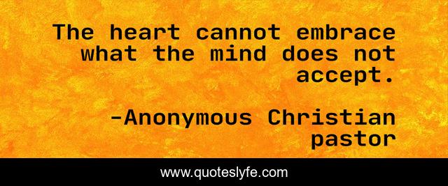 This page presents the quote "The heart cannot embrace what the mind does not accept.". Author of this quote is Anonymous Christian pastor. This quote is about heart, embrace, mind, accept,.