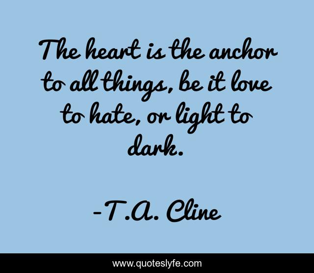 This page presents the quote "The heart is the anchor to all things, be it love to hate, or light to dark.". Author of this quote is T.A. Cline. This quote is about heart, life, love, being, light, soul, dark, live, hate,.