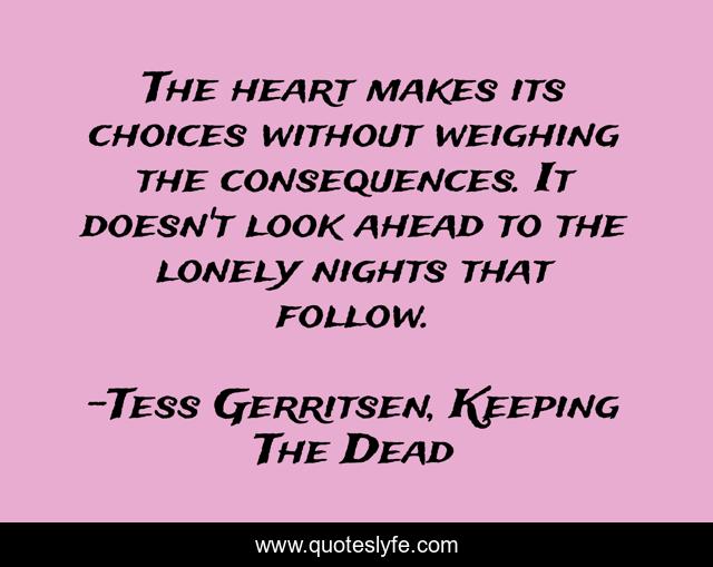 This page presents the quote "The heart makes its choices without weighing the consequences. It doesn't look ahead to the lonely nights that follow.". Author of this quote is Tess Gerritsen, Keeping The Dead. This quote is about heart, life, love, affection,.