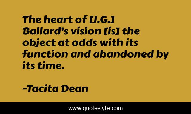 This page presents the quote "The heart of [J.G.] Ballard's vision [is] the object at odds with its function and abandoned by its time.". Author of this quote is Tacita Dean. This quote is about literary-criticism, art,.