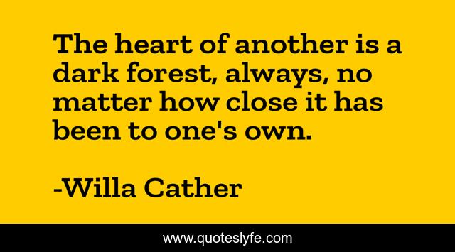 This page presents the quote "The heart of another is a dark forest, always, no matter how close it has been to one's own.". Author of this quote is Willa Cather. This quote is about dark, heart, forest,.