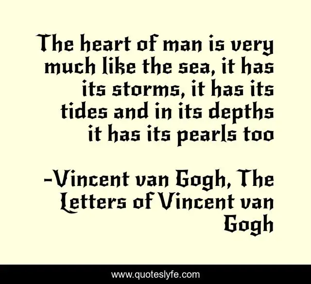 This page presents the quote "The heart of man is very much like the sea, it has its storms, it has its tides and in its depths it has its pearls too". Author of this quote is Vincent van Gogh, The Letters of Vincent van Gogh. This quote is about heart, love, storms, soul, sea, affection, man,.