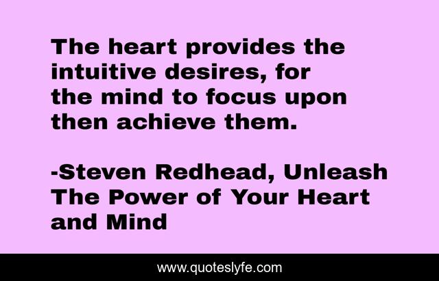 This page presents the quote "The heart provides the intuitive desires, for the mind to focus upon then achieve them.". Author of this quote is Steven Redhead, Unleash The Power of Your Heart and Mind. This quote is about heart, desires, mind, focus, intuitive-desires, achieve,.