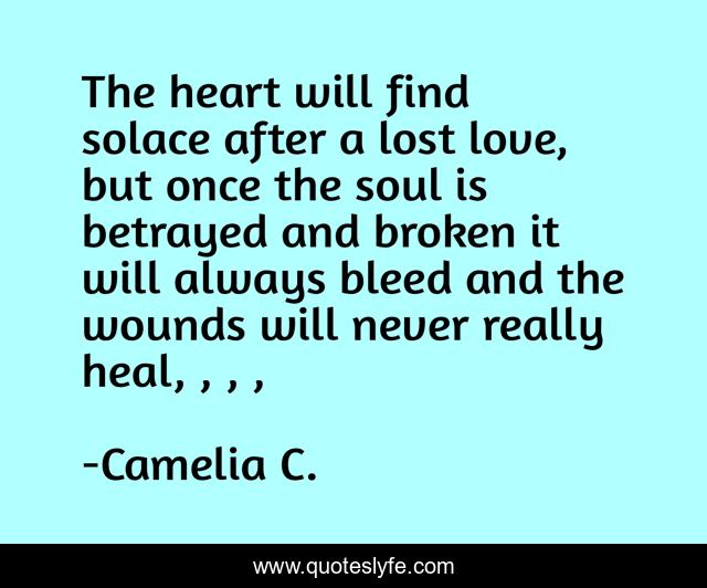 This page presents the quote "The heart will find solace after a lost love, but once the soul is betrayed and broken it will always bleed and the wounds will never really heal, , , , ". Author of this quote is Camelia C.. This quote is about broken-heart, deception,.