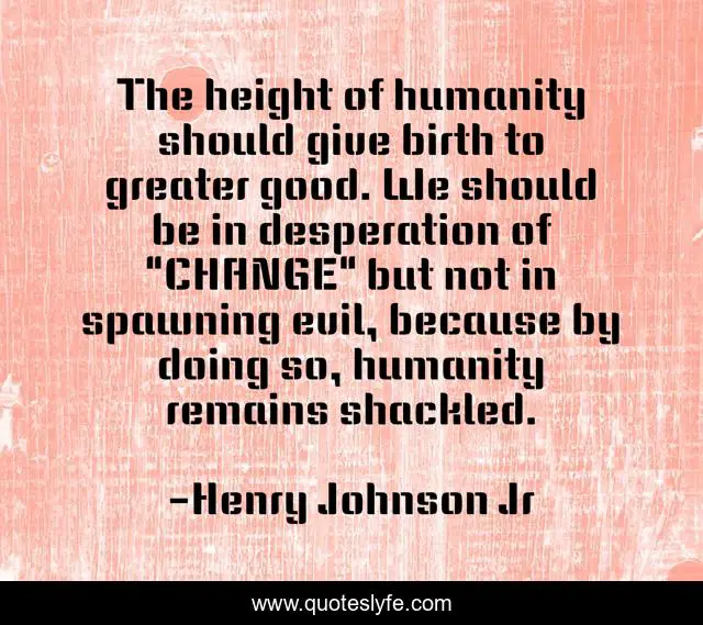 This page presents the quote "The height of humanity should give birth to greater good. We should be in desperation of "CHANGE" but not in spawning evil, because by doing so, humanity remains shackled.". Author of this quote is Henry Johnson Jr. This quote is about world, peacefulness, change-your-life, humanity, quotes-to-inspire,.
