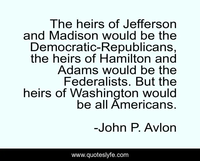 This page presents the quote "The heirs of Jefferson and Madison would be the Democratic-Republicans, the heirs of Hamilton and Adams would be the Federalists. But the heirs of Washington would be all Americans.". Author of this quote is John P. Avlon. This quote is about politics, governmentnt, george-washington, history, american-history,.