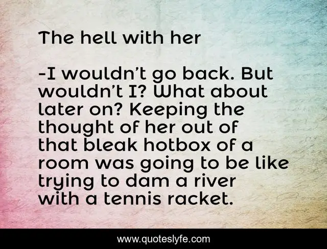 "I wouldn’t go back. But wouldn’t I? What about later on? Keeping the thought of her out of that bleak hotbox of a room was going to be like trying to dam a river with a tennis racket. Quotes." Quoteslyfe.com, 2025. Fri. 05 Dec. 2025. <https://www.quoteslyfe.com/quote/The-hell-with-her-96533>.