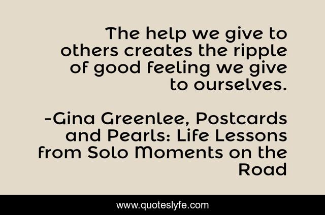 This page presents the quote "The help we give to others creates the ripple of good feeling we give to ourselves.". Author of this quote is Gina Greenlee, Postcards and Pearls: Life Lessons from Solo Moments on the Road. This quote is about ripple-effect, positive-outlook, positivity, helping-people, positive-attitude, helping-others,.
