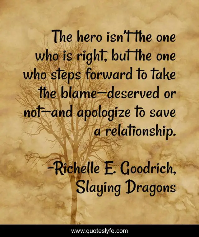 This page presents the quote "The hero isn’t the one who is right, but the one who steps forward to take the blame—deserved or not—and apologize to save a relationship.". Author of this quote is Richelle E. Goodrich, Slaying Dragons. This quote is about hero, apology, richelle-e-goodrich, richelle, i-m-sorry, apologize, richelle-goodrich, heroes,.