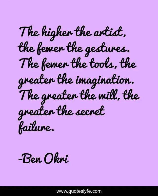 This page presents the quote "The higher the artist, the fewer the gestures. The fewer the tools, the greater the imagination. The greater the will, the greater the secret failure.". Author of this quote is Ben Okri. This quote is about imagination, tools, artist,.