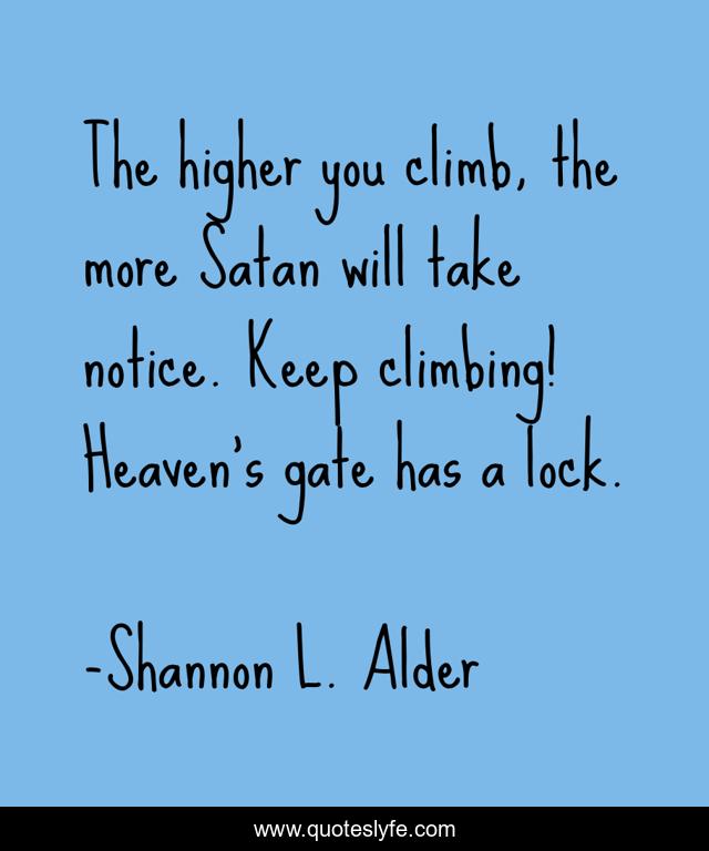 This page presents the quote "The higher you climb, the more Satan will take notice. Keep climbing! Heaven's gate has a lock.". Author of this quote is Shannon L. Alder. This quote is about achievements, faith, hurdles, heaven, lost-people, success, obstacles, hell-to-well, rising,.