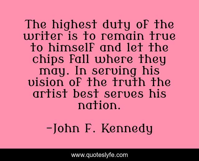 This page presents the quote "The highest duty of the writer is to remain true to himself and let the chips fall where they may. In serving his vision of the truth the artist best serves his nation.". Author of this quote is John F. Kennedy. This quote is about duty, artist, john-f-kennedy, writers, writing-advice,.