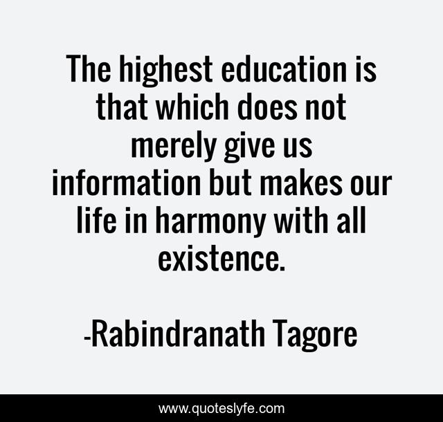 This page presents the quote "The highest education is that which does not merely give us information but makes our life in harmony with all existence.". Author of this quote is Rabindranath Tagore. This quote is about information, life, harmony,.