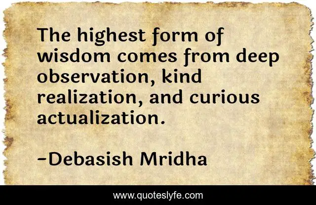 This page presents the quote "The highest form of wisdom comes from deep observation, kind realization, and curious actualization.". Author of this quote is Debasish Mridha. This quote is about actualization, philosophy, debasish-mridha, highest-form-of-wisdom, quotes, inspirational, realization, enthusiasm, wisdom,.