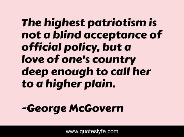 This page presents the quote "The highest patriotism is not a blind acceptance of official policy, but a love of one's country deep enough to call her to a higher plain.". Author of this quote is George McGovern. This quote is about acceptance, love, deep, affection,.