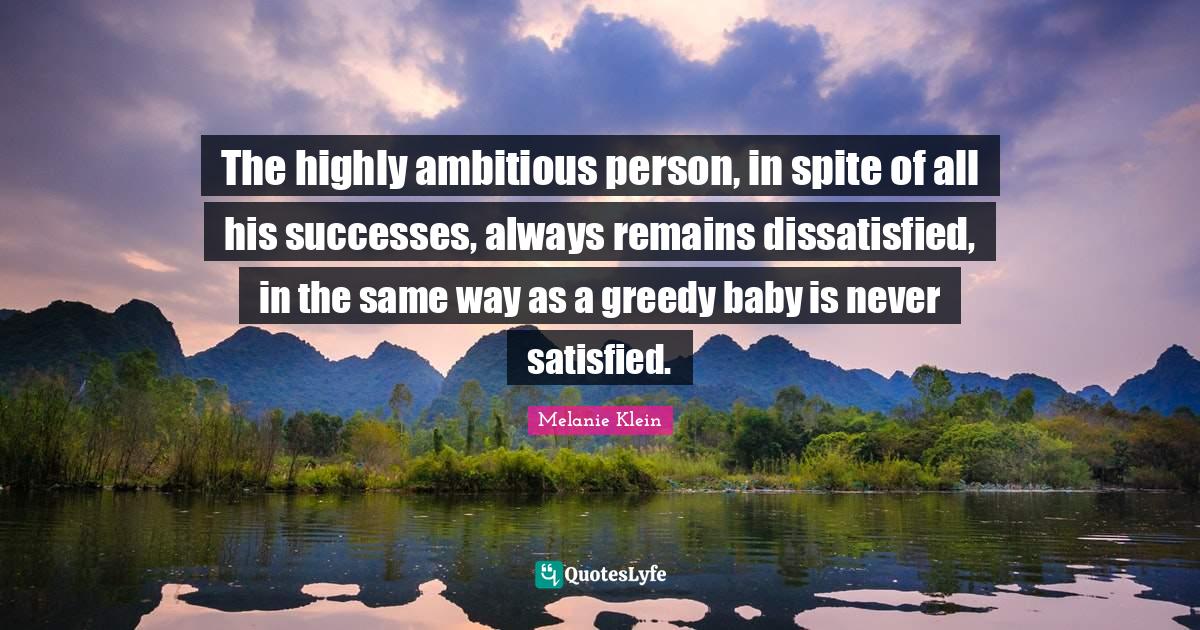 This page presents the quote "The highly ambitious person, in spite of all his successes, always remains dissatisfied, in the same way as a greedy baby is never satisfied.". Author of this quote is Melanie Klein. This quote is about baby, greedy, ambitious, way, remains, ambitious person, satisfied, spite, ambition,.