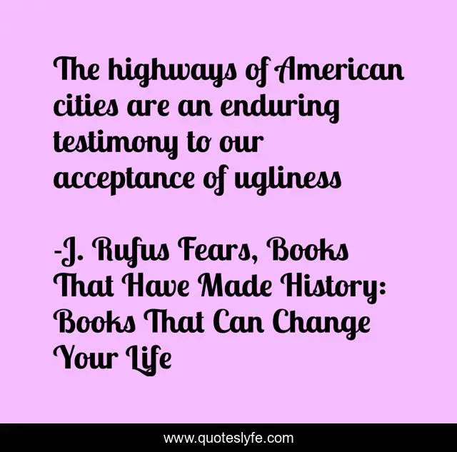 This page presents the quote "The highways of American cities are an enduring testimony to our acceptance of ugliness". Author of this quote is J. Rufus Fears, Books That Have Made History: Books That Can Change Your Life. This quote is about culture, tackiness, beauty, commercialism,.