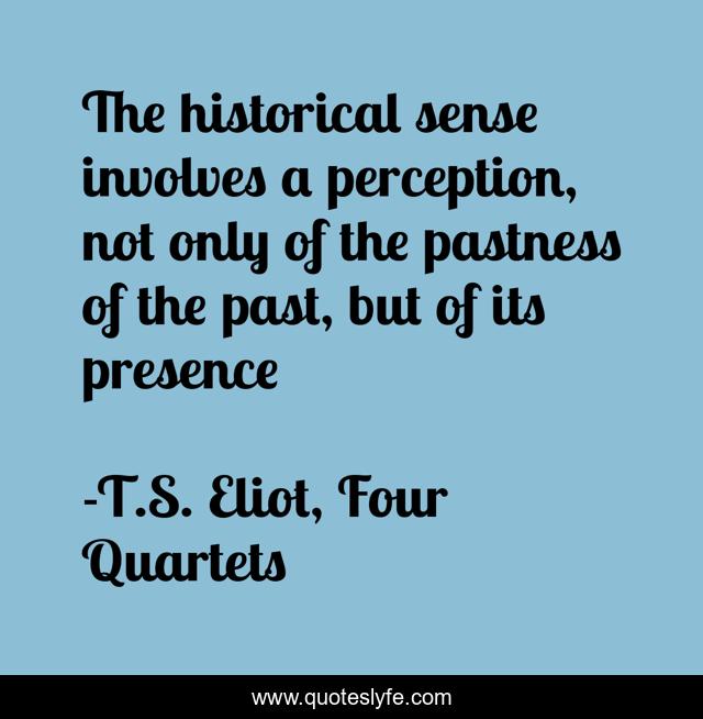 This page presents the quote "The historical sense involves a perception, not only of the pastness of the past, but of its presence". Author of this quote is T.S. Eliot, Four Quartets. This quote is about perception, human-perception, presence, jared-wheat, the-past, past, historical-perspective, historical, clarity-of-perception,.