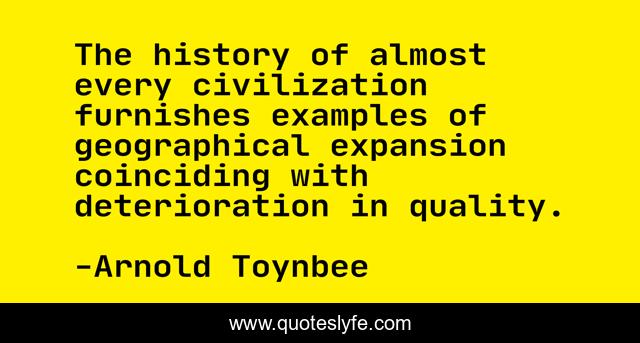 This page presents the quote "The history of almost every civilization furnishes examples of geographical expansion coinciding with deterioration in quality.". Author of this quote is Arnold Toynbee. This quote is about historians, history,.