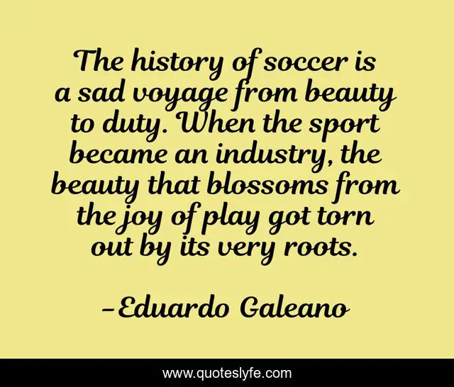 This page presents the quote "The history of soccer is a sad voyage from beauty to duty. When the sport became an industry, the beauty that blossoms from the joy of play got torn out by its very roots.". Author of this quote is Eduardo Galeano. This quote is about joy, beauty, history,.
