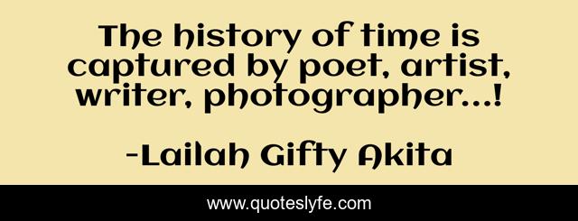 This page presents the quote "The history of time is captured by poet, artist, writer, photographer…!". Author of this quote is Lailah Gifty Akita. This quote is about capture, wise-words, literature, artist, writer, poet, history,.