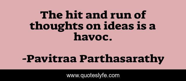 This page presents the quote "The hit and run of thoughts on ideas is a havoc.". Author of this quote is Pavitraa Parthasarathy. This quote is about ideas, thoughts, havoc,.