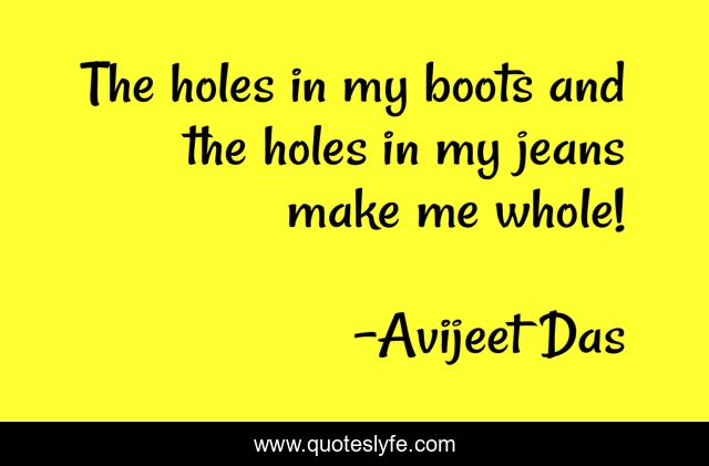 This page presents the quote "The holes in my boots and the holes in my jeans make me whole!". Author of this quote is Avijeet Das. This quote is about life, philosophy, jeans, boots, life-and-sayings, life-lessons,.