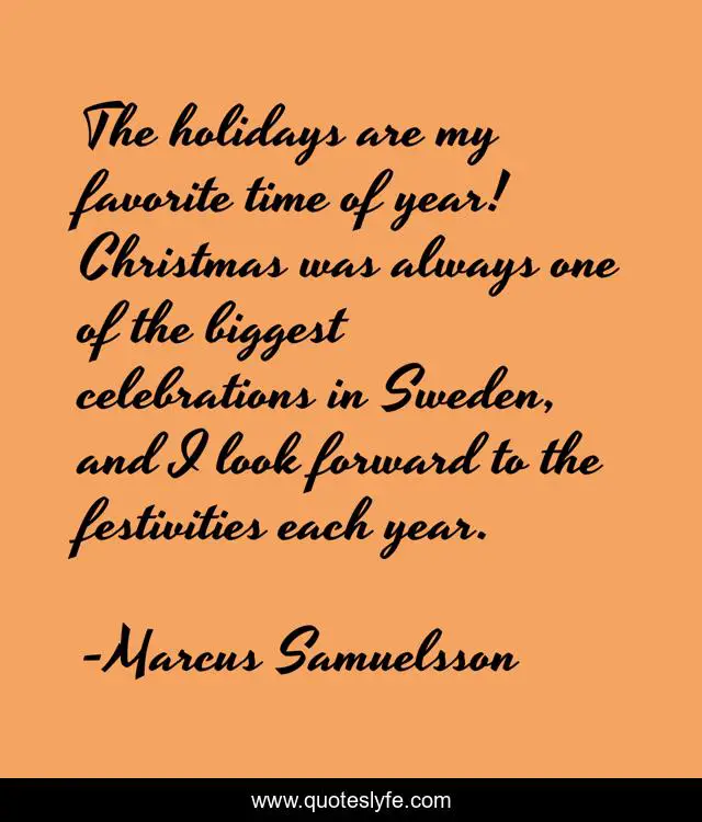 This page presents the quote "The holidays are my favorite time of year! Christmas was always one of the biggest celebrations in Sweden, and I look forward to the festivities each year.". Author of this quote is Marcus Samuelsson. This quote is about time, look, holidays,.