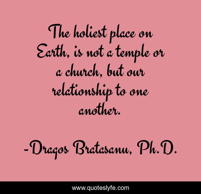This page presents the quote "The holiest place on Earth, is not a temple or a church, but our relationship to one another.". Author of this quote is Dragos Bratasanu, Ph.D.. This quote is about relationships, love, people, wisdom, earth, inspirational, church, enthusiasm, friendship,.