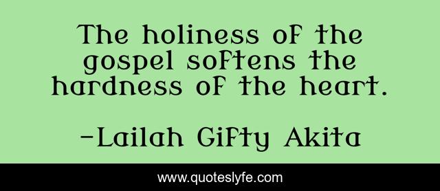 This page presents the quote "The holiness of the gospel softens the hardness of the heart.". Author of this quote is Lailah Gifty Akita. This quote is about christian, scriptures, theology, doubt, unbelieving, gospel, hardness,.