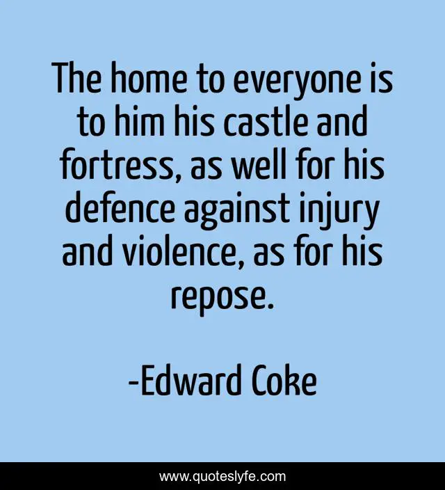 This page presents the quote "The home to everyone is to him his castle and fortress, as well for his defence against injury and violence, as for his repose.". Author of this quote is Edward Coke. This quote is about castle, violence, well,.