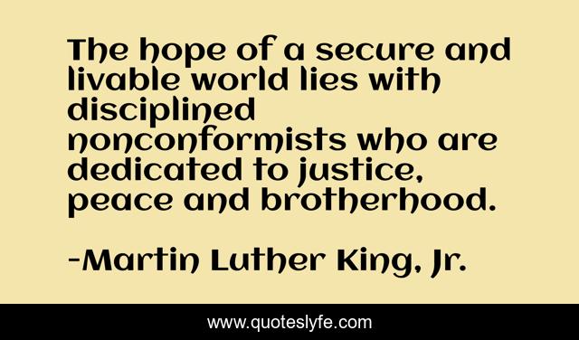 This page presents the quote "The hope of a secure and livable world lies with disciplined nonconformists who are dedicated to justice, peace and brotherhood.". Author of this quote is Martin Luther King, Jr.. This quote is about justice, world, peace,.