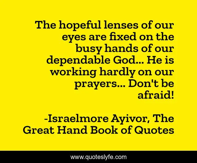 This page presents the quote "The hopeful lenses of our eyes are fixed on the busy hands of our dependable God... He is working hardly on our prayers... Don't be afraid!". Author of this quote is Israelmore Ayivor, The Great Hand Book of Quotes. This quote is about eyes, busy, work-hard, hard-work, prayers, god, fix, hopeful, food-for-thought,.
