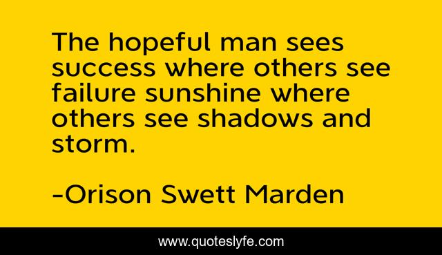 This page presents the quote "The hopeful man sees success where others see failure sunshine where others see shadows and storm.". Author of this quote is Orison Swett Marden. .