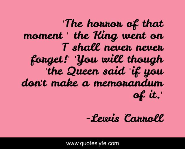 This page presents the quote "'The horror of that moment ' the King went on T shall never never forget!' 'You will though 'the Queen said 'if you don't make a memorandum of it.'". Author of this quote is Lewis Carroll. .
