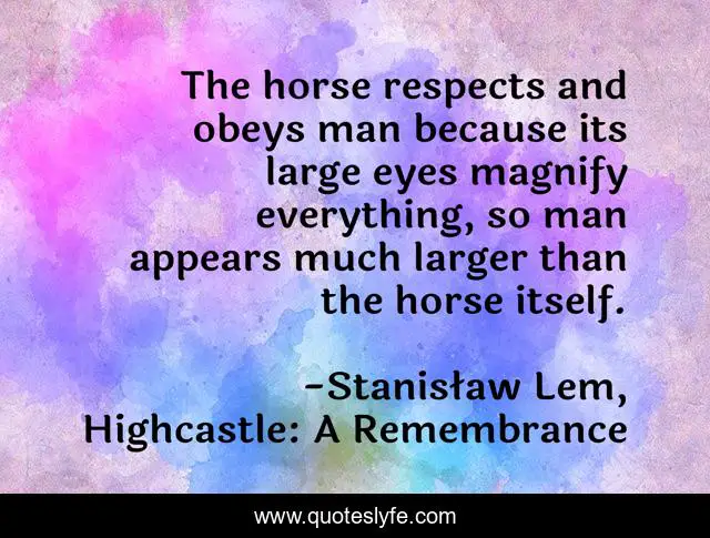 This page presents the quote "The horse respects and obeys man because its large eyes magnify everything, so man appears much larger than the horse itself.". Author of this quote is Stanisław Lem, Highcastle: A Remembrance. This quote is about eyes, size,.
