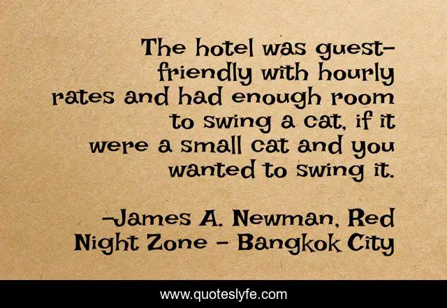 This page presents the quote "The hotel was guest-friendly with hourly rates and had enough room to swing a cat, if it were a small cat and you wanted to swing it.". Author of this quote is James A. Newman, Red Night Zone - Bangkok City. This quote is about bangkok-fiction, noir, crime,.