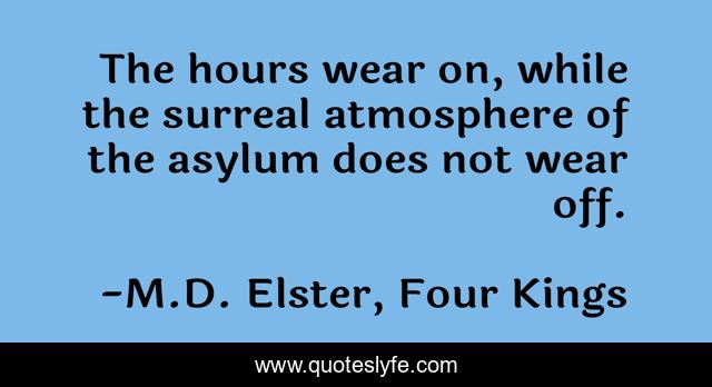This page presents the quote "The hours wear on, while the surreal atmosphere of the asylum does not wear off.". Author of this quote is M.D. Elster, Four Kings. This quote is about insane, crazy, retellings, madness, insane-asylum, retelling, alice, asylum-tales, hours,.