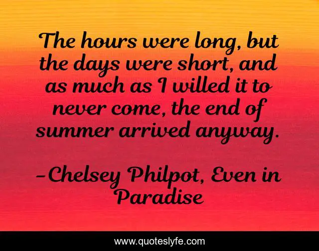 This page presents the quote "The hours were long, but the days were short, and as much as I willed it to never come, the end of summer arrived anyway.". Author of this quote is Chelsey Philpot, Even in Paradise. This quote is about summer, time, young, summertime, nostalgia,.