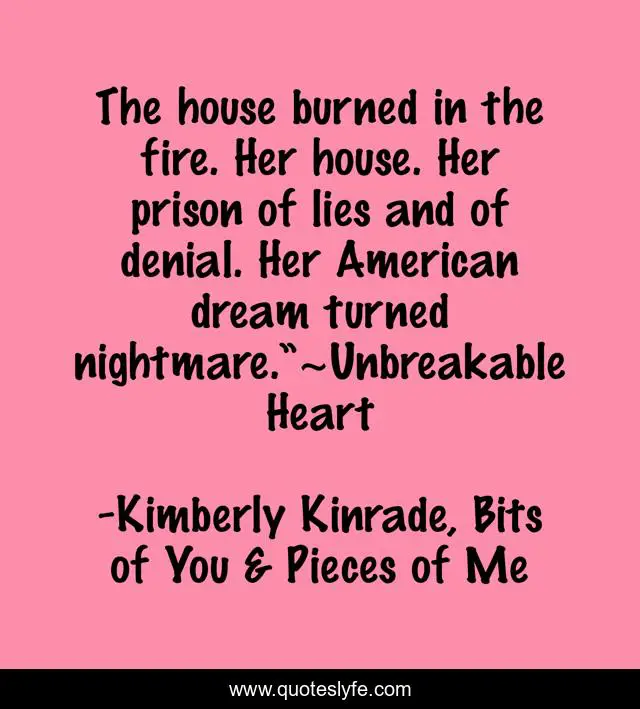 This page presents the quote "The house burned in the fire. Her house. Her prison of lies and of denial. Her American dream turned nightmare.”~Unbreakable Heart". Author of this quote is Kimberly Kinrade, Bits of You & Pieces of Me. This quote is about poetry, collection,.