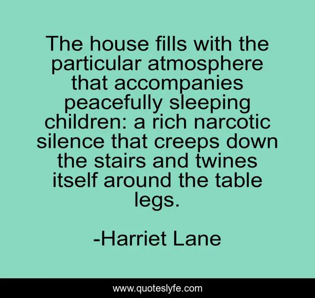 This page presents the quote "The house fills with the particular atmosphere that accompanies peacefully sleeping children: a rich narcotic silence that creeps down the stairs and twines itself around the table legs.". Author of this quote is Harriet Lane. This quote is about children, silence,.