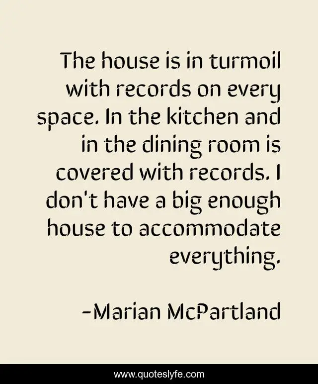 This page presents the quote "The house is in turmoil with records on every space. In the kitchen and in the dining room is covered with records. I don't have a big enough house to accommodate everything.". Author of this quote is Marian McPartland. This quote is about house, kitchen, records,.