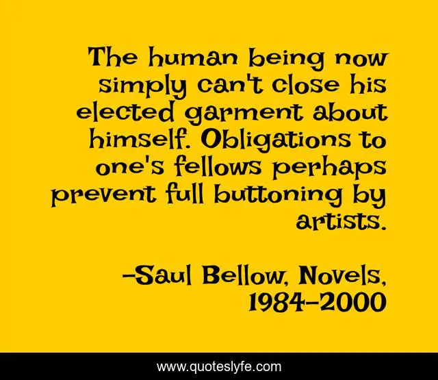 This page presents the quote "The human being now simply can't close his elected garment about himself. Obligations to one's fellows perhaps prevent full buttoning by artists.". Author of this quote is Saul Bellow, Novels, 1984-2000. This quote is about art, humanity, artists,.