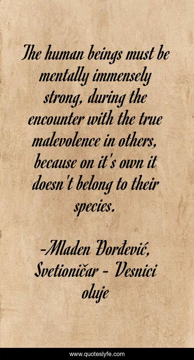 This page presents the quote "The human beings must be mentally immensely strong, during the encounter with the true malevolence in others, because on it's own it doesn't belong to their species.". Author of this quote is Mladen Đorđević, Svetioničar - Vesnici oluje. This quote is about malevolence, human-nature, human-beings, evil, human, mentally-strong, species, conflict,.