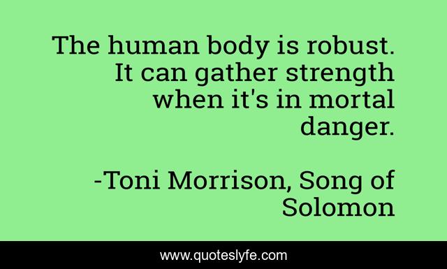 This page presents the quote "The human body is robust. It can gather strength when it's in mortal danger.". Author of this quote is Toni Morrison, Song of Solomon. This quote is about strength, fear, death, adrenaline, danger,.