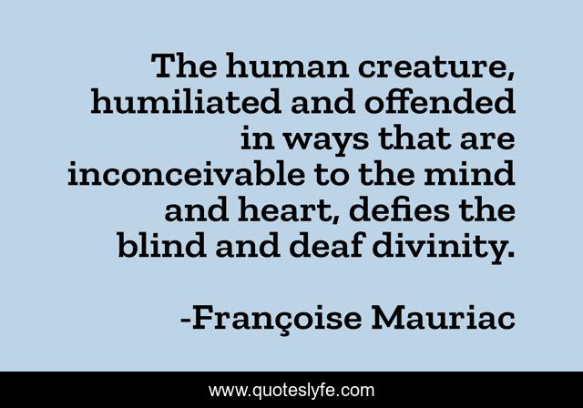 This page presents the quote "The human creature, humiliated and offended in ways that are inconceivable to the mind and heart, defies the blind and deaf divinity.". Author of this quote is Françoise Mauriac. This quote is about god, defiance, divinity, human-nature, pain,.