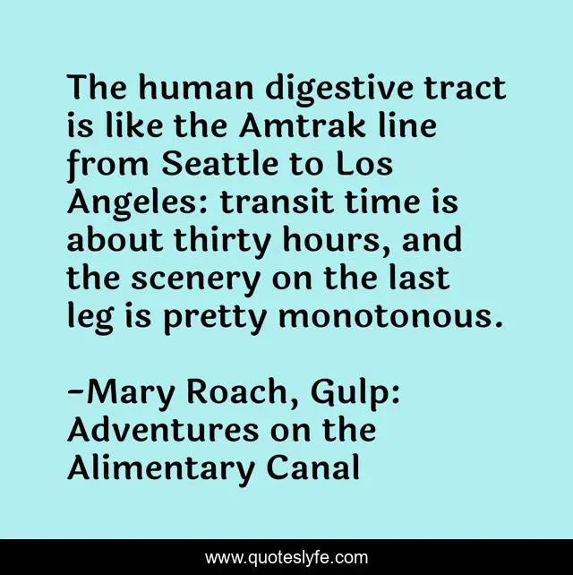 This page presents the quote "The human digestive tract is like the Amtrak line from Seattle to Los Angeles: transit time is about thirty hours, and the scenery on the last leg is pretty monotonous.". Author of this quote is Mary Roach, Gulp: Adventures on the Alimentary Canal. This quote is about science, footnotes, humor,.